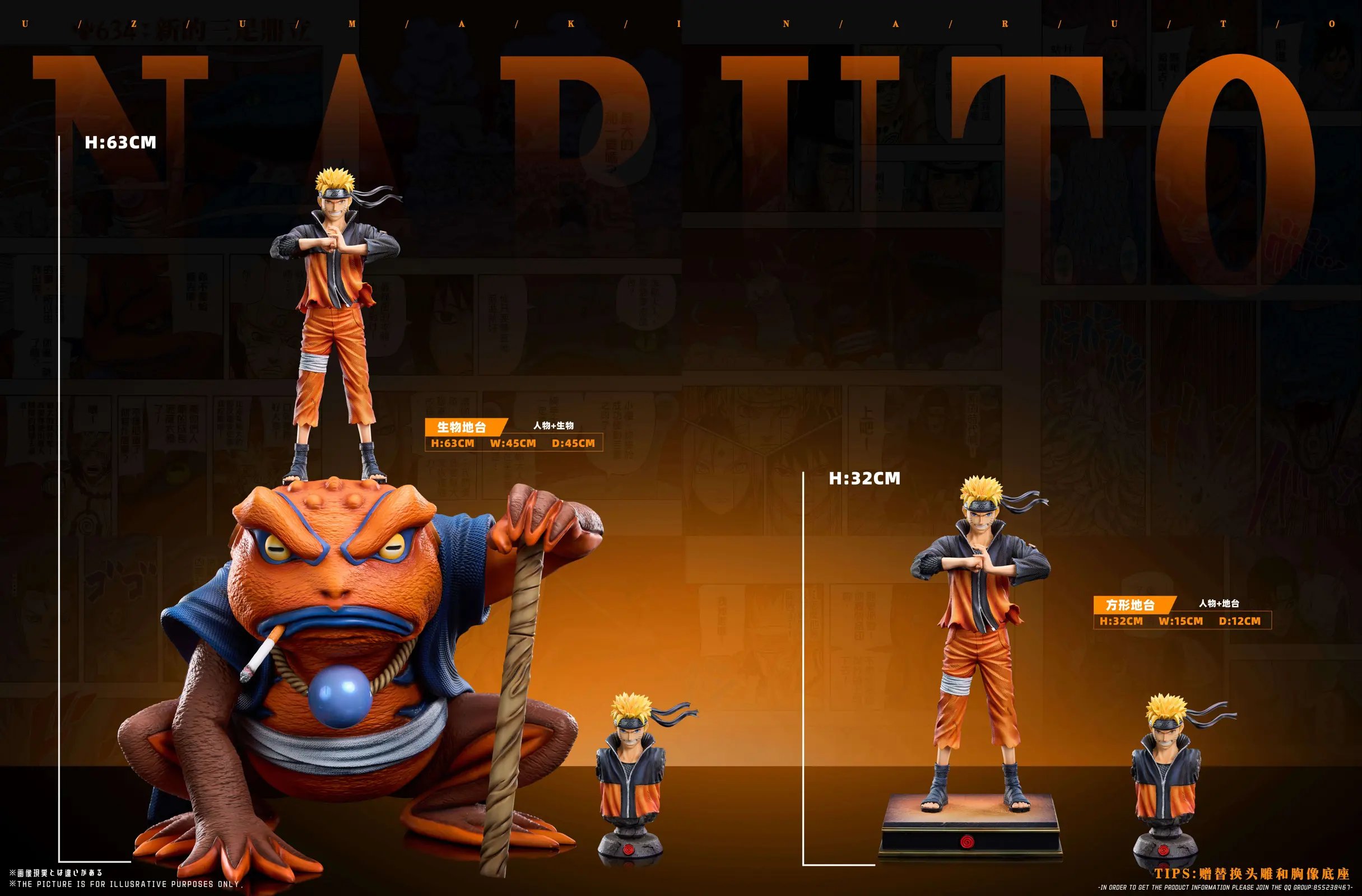 - Naruto. Square: H32 * W16 * D12cm Estimated; Summoning Base: H63 * W45 * D46cm Estimated; Limited to 188pcs in TOTAL