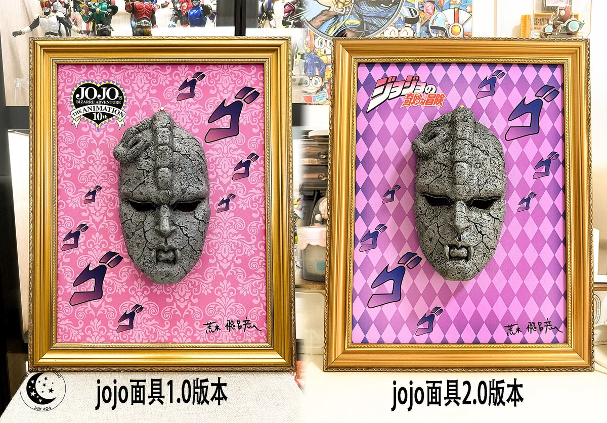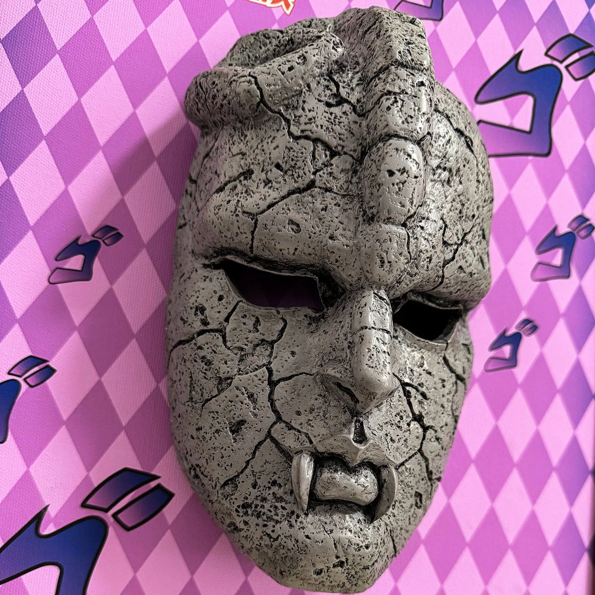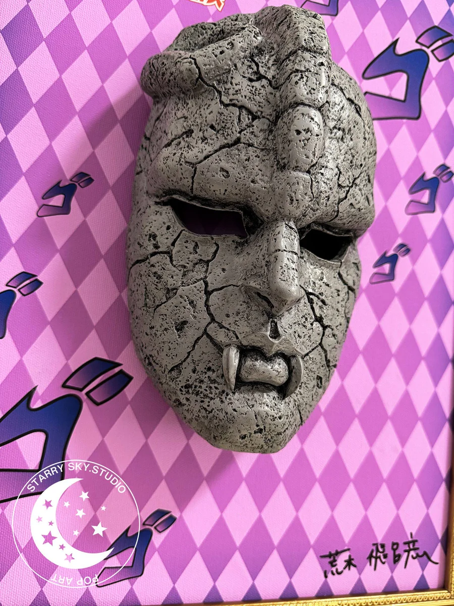 - The iconic Stone Mask is crafted from high-quality resin material, featuring intricate panel lining textures that perfectly capture its ancient, stony appearance.
